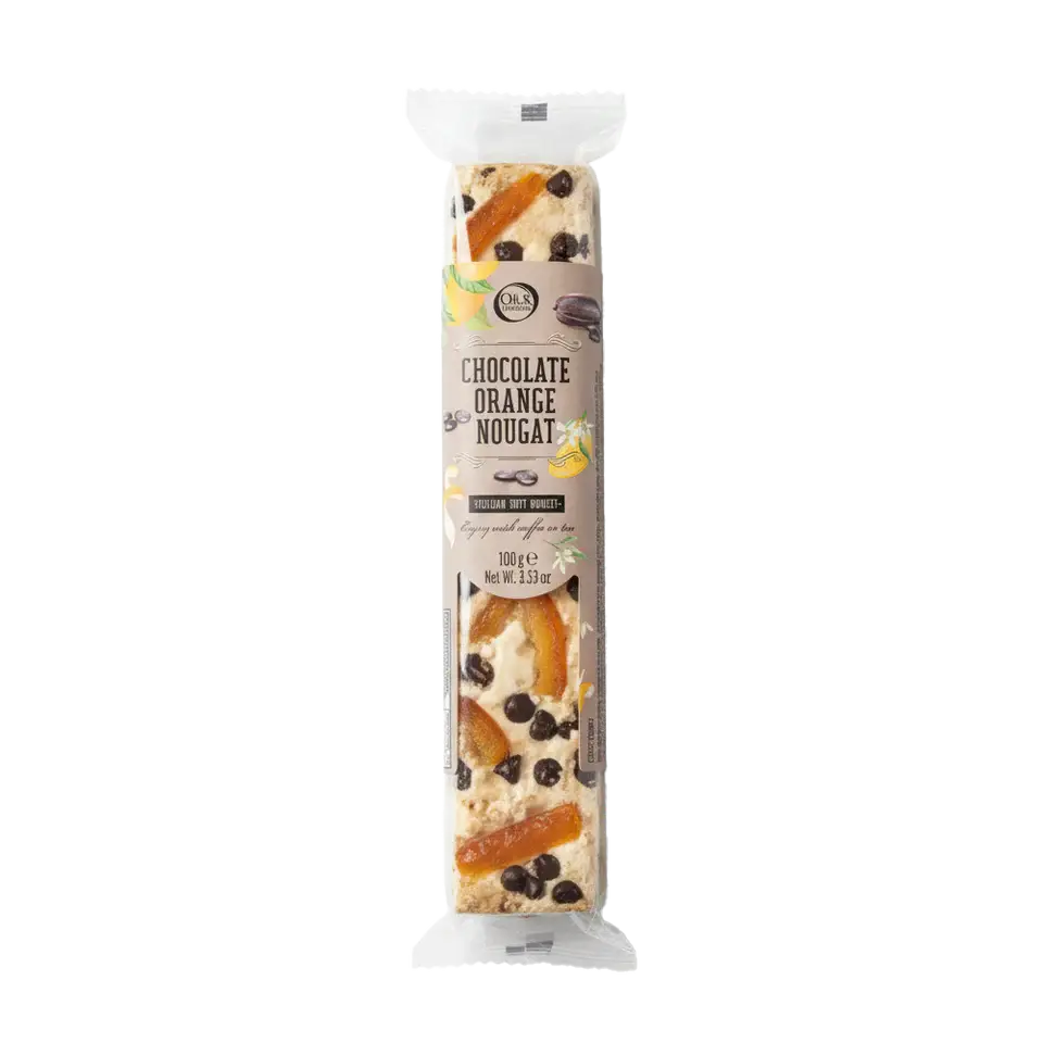 Delicious Italian nougat with dark chocolate chunks and fresh Sicilian orange. An irresistible combination of creamy sweetness, rich cocoa, and refreshing citrus. Perfect with coffee, as a special treat on a dessert platter, or as a festive gift.
